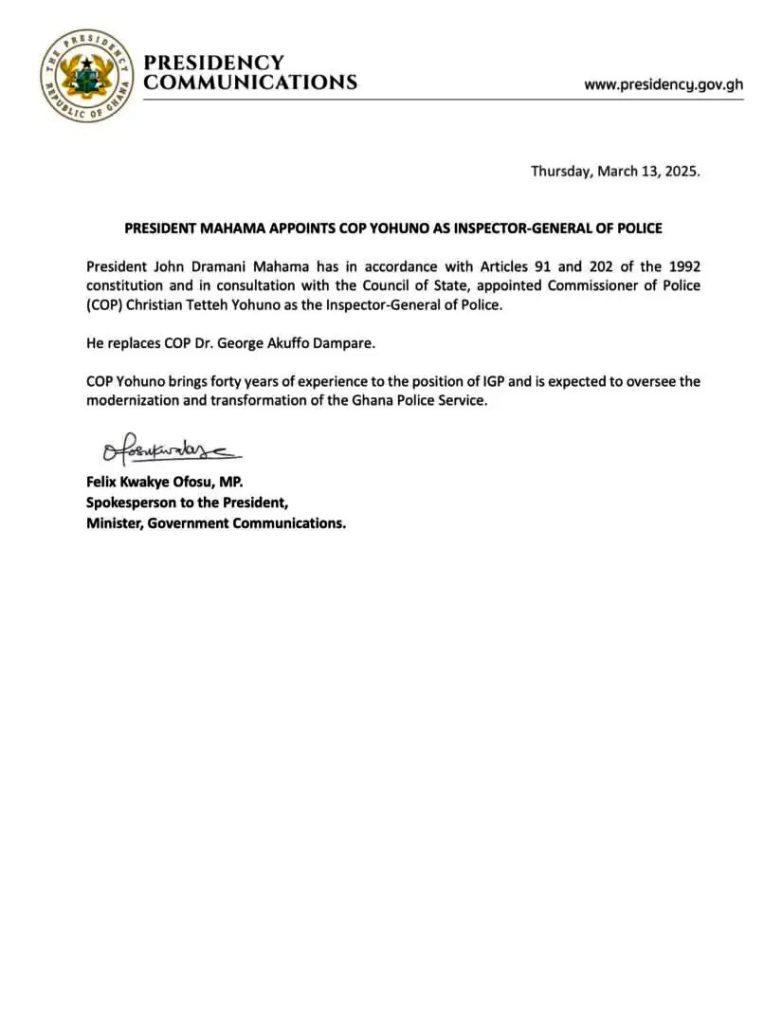 The situation has been compounded by the government’s silence on the matter. Felix Kwakye Ofosu, Spokesperson to the President and Minister for Government Communications, who signed the 13 March 2025 letter dismissing COP Dampare and appointing Yohuno, has not issued any statement regarding the post-retirement contract.