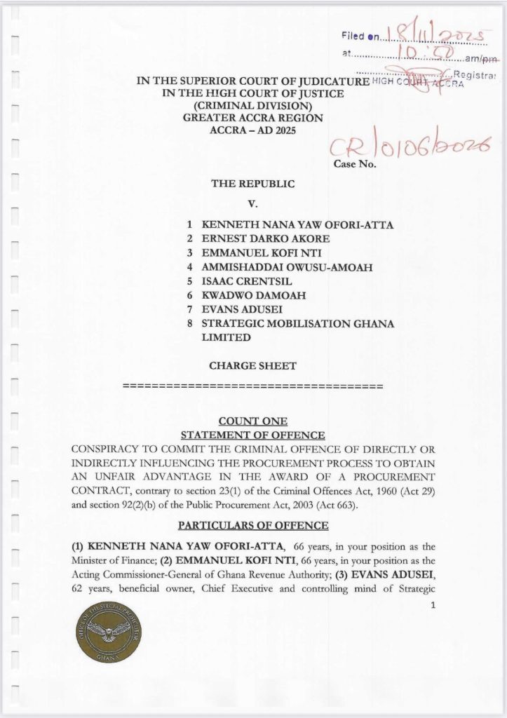 The charge sheet, dated 18 November 2025, lists former Finance Minister Kenneth Nana Yaw Ofori-Atta as the first accused. Other key individuals include former Ghana Revenue Authority (GRA) Acting Commissioner-General Emmanuel Kofi Nti, and the Chief Executive of SML, Evans Edusei. SML itself is also named as an accused entity.