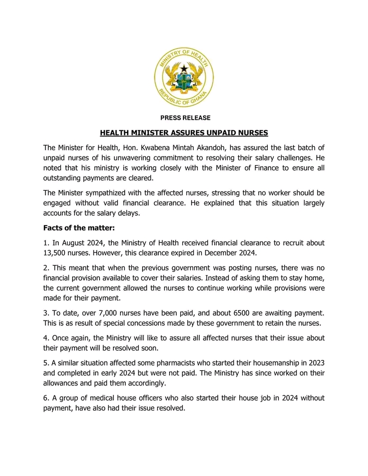 In a statement issued by the Ministry of Health, Mr Akandoh reaffirmed his commitment to working with the Ministry of Finance to clear all outstanding arrears. He sympathised with the affected nurses and stressed that no health worker should be engaged without valid financial clearance.