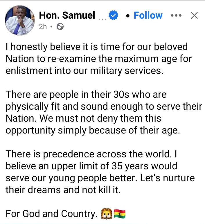 Citing international precedents, Sam George suggested that extending the upper age limit to 35 years would better serve the aspirations of many young Ghanaians seeking to join the military.
