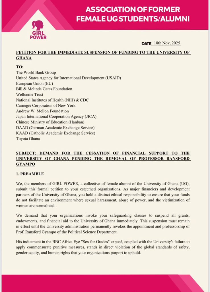 A group of female alumni from the University of Ghana is calling on major international donors to halt financial support to the institution, citing concerns over its handling of a high-profile “sex-for-grades” scandal.